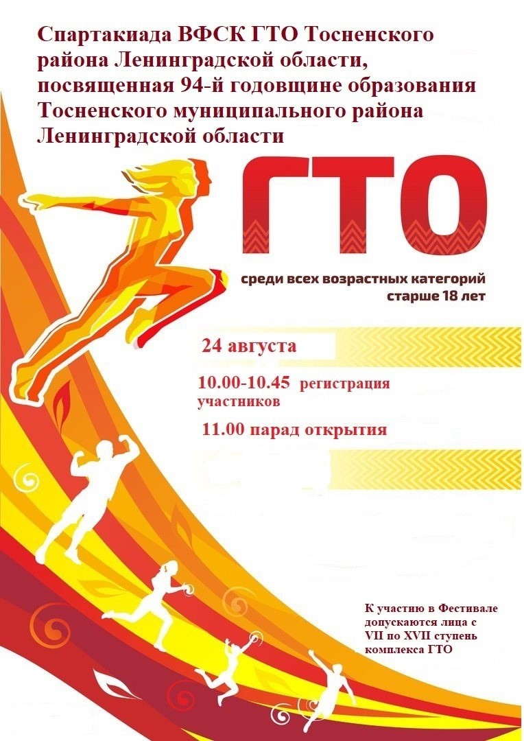 Приглашаем 24 августа 2024 года принять участие в Спартакиаде Всероссийского физкультурно-спортивного комплекса «Готов к труду и обороне» (ГТО) посвященной 94-й годовщине образования Тосненского муниципального района Ленинградской области